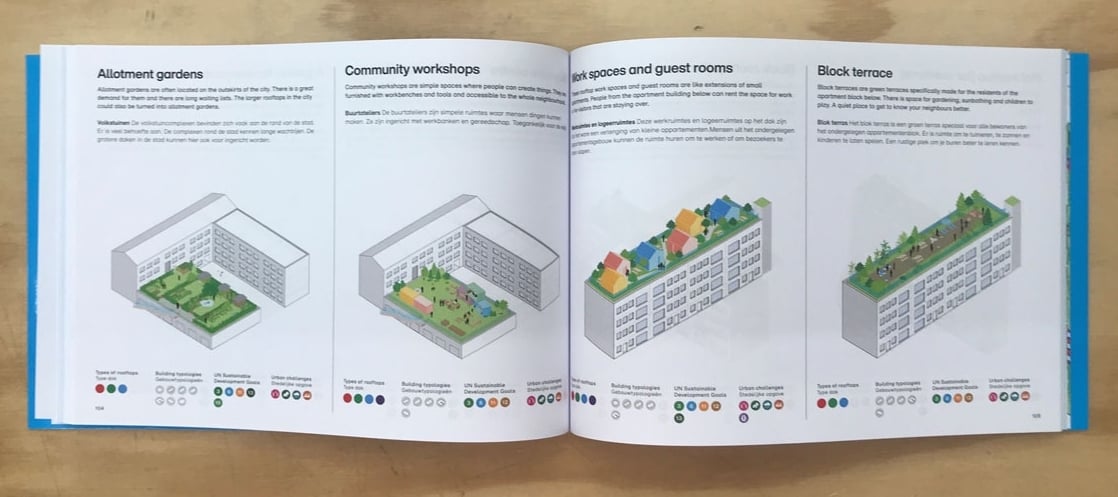 Meant to be a practical guide, the catalogue includes which types of roofs an idea can be used on, which UN Sustainable Development Goals are applicable, and which urban challenges it addresses. The ideas are also color-coded based on the functions they add: a yellow rooftop, for example, provides renewable energy, while a red rooftop offers social opportunities.