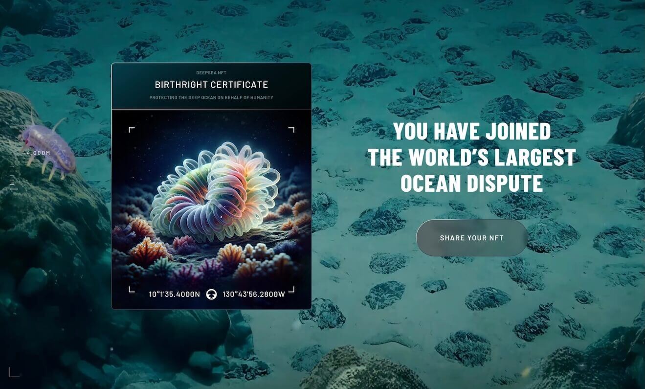 Every participant will be issued a unique DEEPSEA NFT stamped with the GPS coordinates they’ve claimed. Available in 90 languages, the NFTs feature depictions of deep sea creatures and are designed to be shared on social media. Notably, they’re offered at no cost. Users are sent a blockchain transaction verifying their claim, but a smart contract ensures the NFT can’t be transferred or speculated with. “Just as you wouldn’t share or sell your passport, this Birthright Certificate is yours alone.”