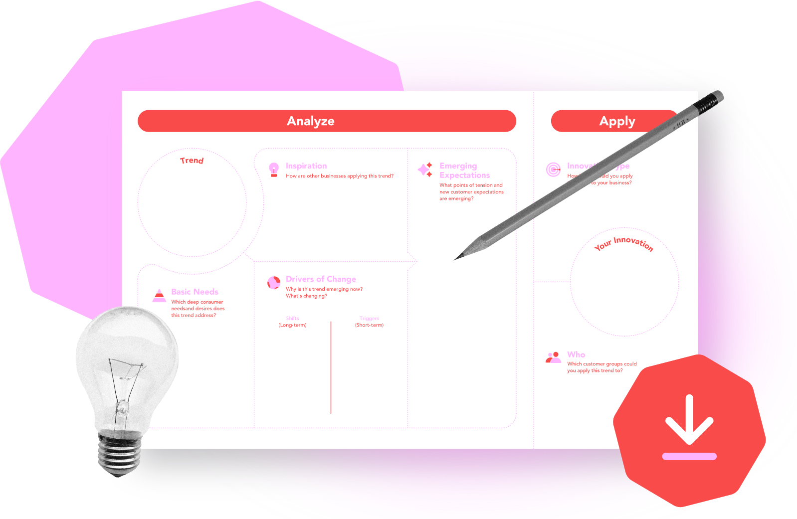 Finally, generate your innovation ideas in this final section. Do this by coming up with as many combinations and permutations of the Emerging Expectations to address, the Innovation Type, and the Target Audience.